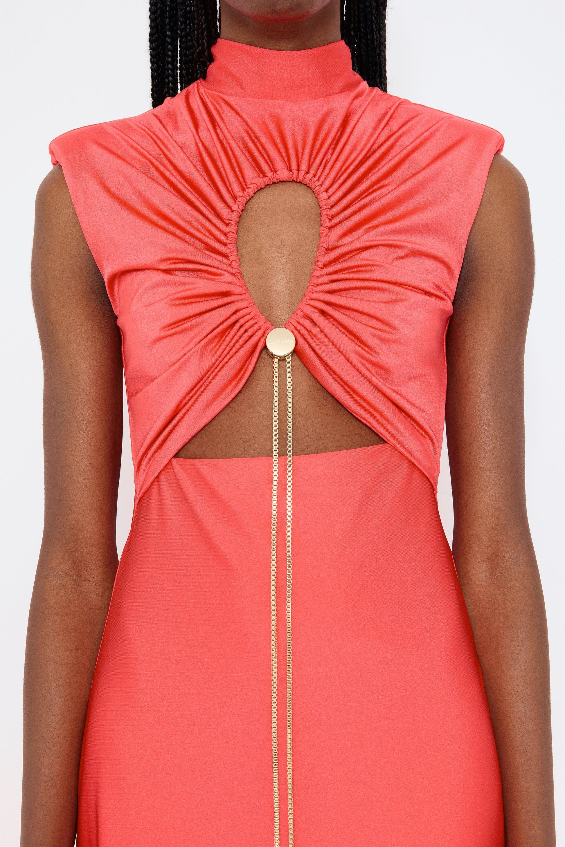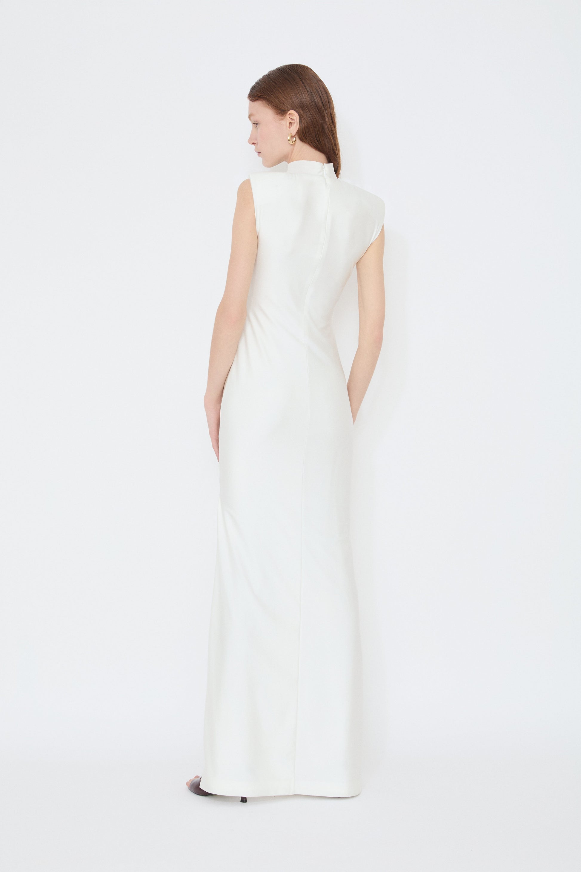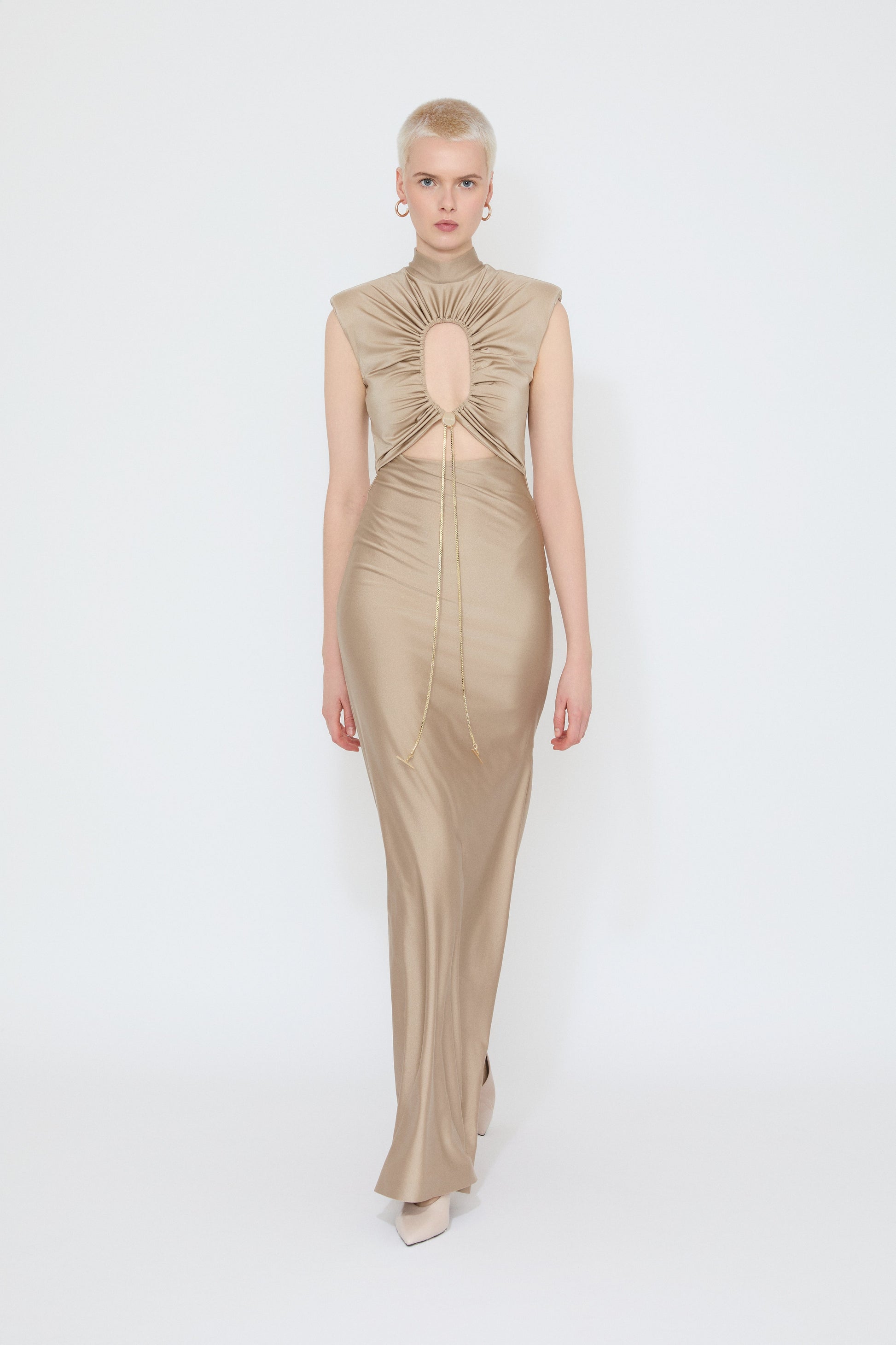 Our Selena Maxi Dress features a sculpting high neckline, ruched keyhole cut-out, and a fluid silhouette that skims the body with ease.