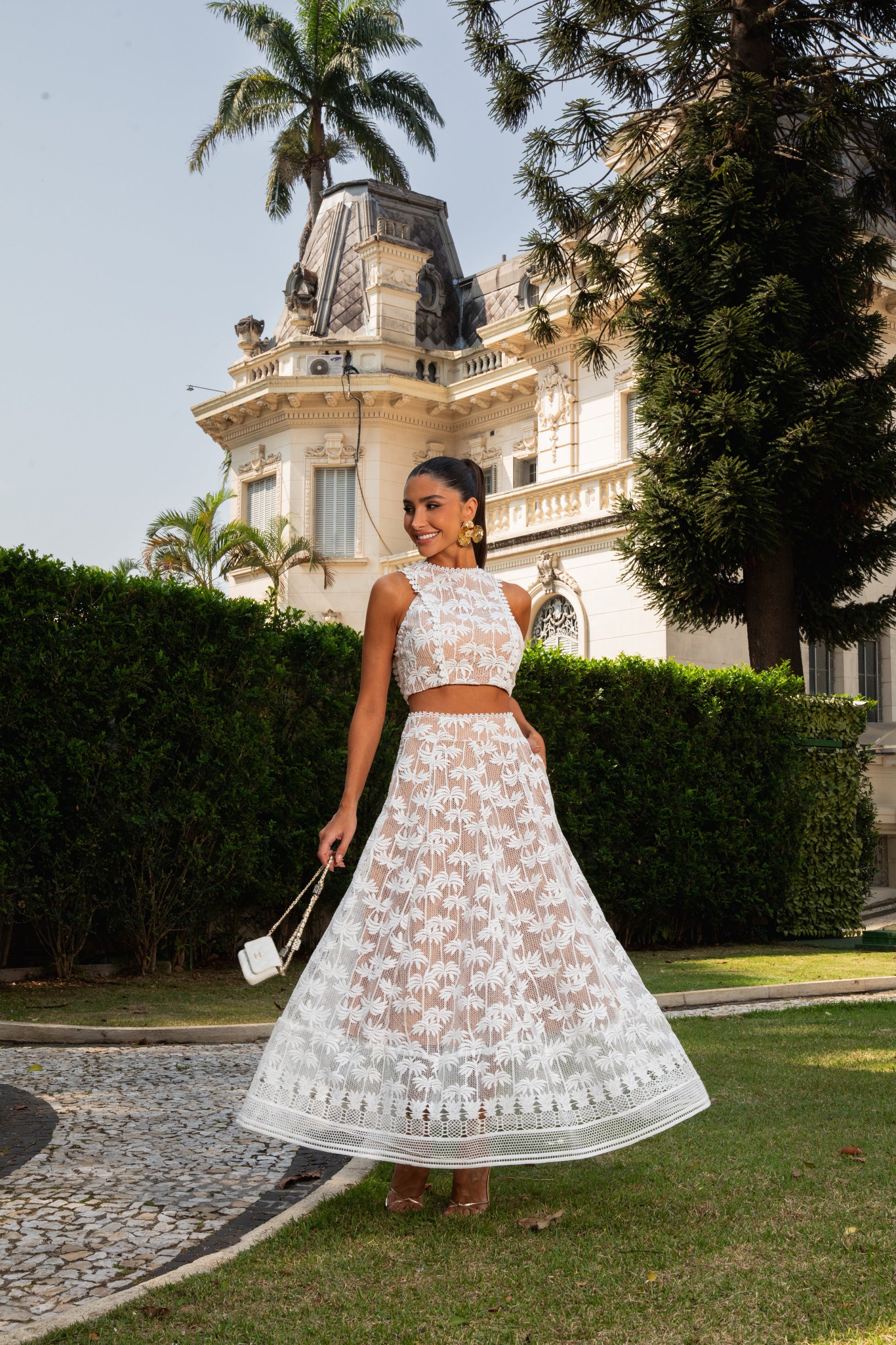 Lace set with embroidered patterns of tropical palm trees in off-white, which provides an elegant contrast with the nude lining. Composed of a high-necked, low-cut top with cups, and a midi flared skirt with lace hem and high waistband. Both have a metal zipper on the back and off-white guipure trim, highlighting the contour and cutouts of the bust.