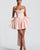 The Mirabella Mini Dress in Blush features a strapless pleated cowl neckline, fitted silhouette with princess seams, and a lace-up back. Tulle panels add volume, while a detachable bow offers elegant versatility. Fully lined with an invisible zipper for a polished finish.